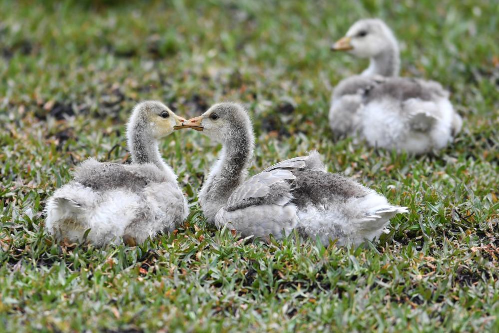 斑头雁幼鸟在甘肃尕海则岔国家级自然保护区的尕海湿地嬉戏。 新华社记者 陈斌 摄