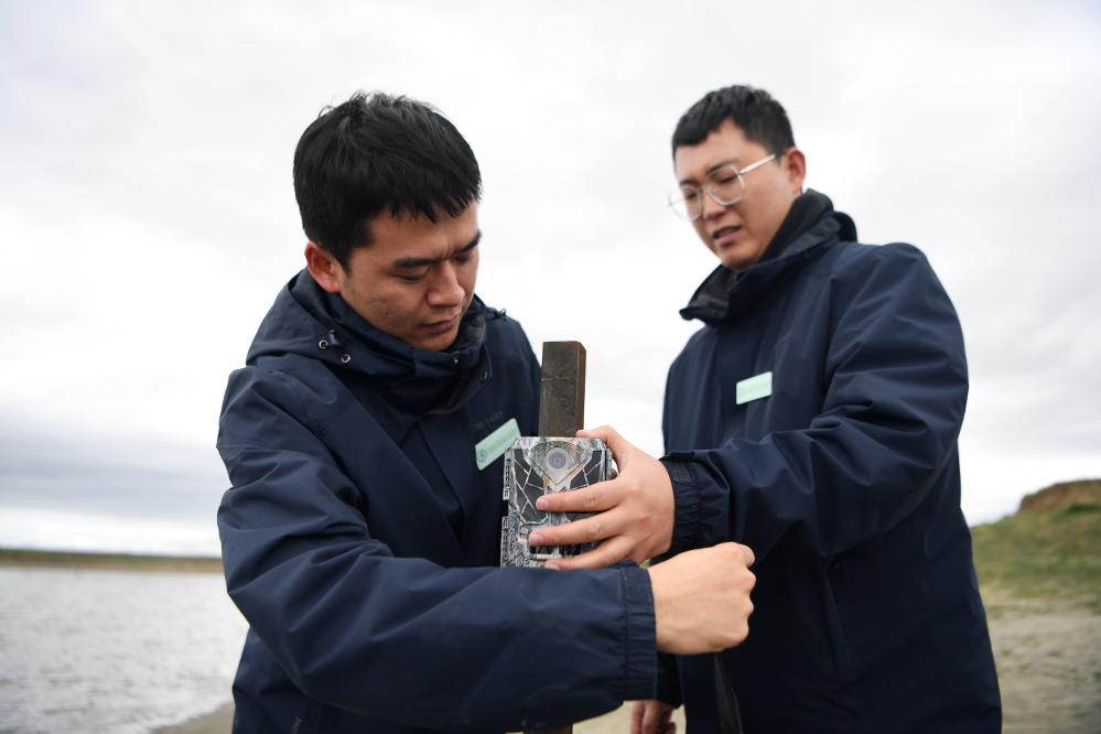 甘肃黄河首曲国家级自然保护区管护中心曼日玛保护站工作人员王佳阳(右)和同事在保护区内安放红外相机。 新华社记者 张可任 摄