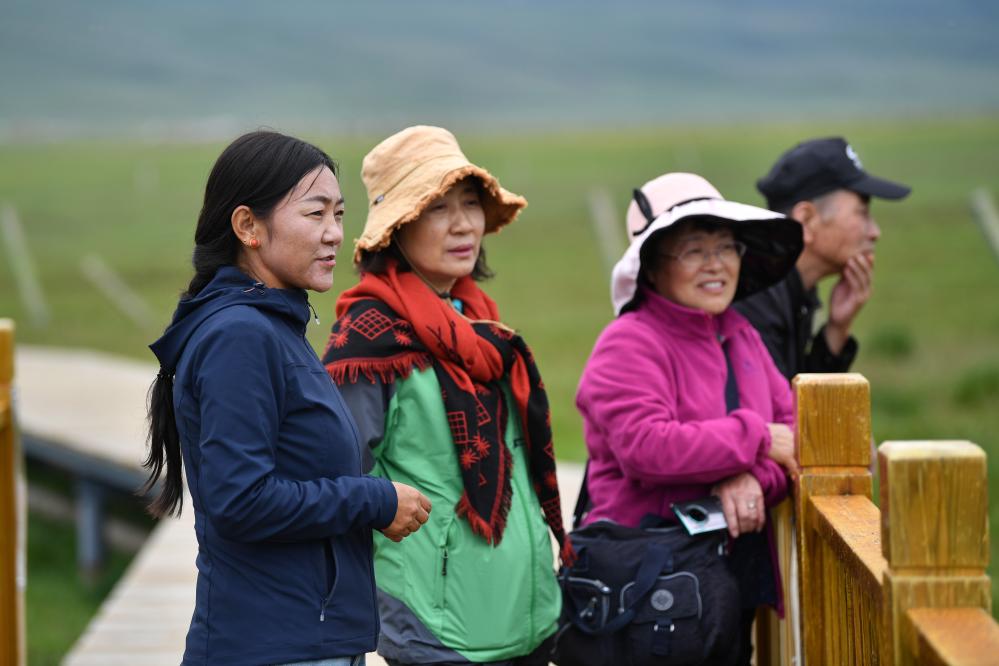 甘肃尕海则岔国家级自然保护区管护中心尕海保护站站长香毛吉(左一)向游客介绍保护区的野生动植物情况。 新华社记者 陈斌 摄