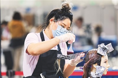 参赛选手在进行美发项目的比赛。刘东岳摄(人民视觉)