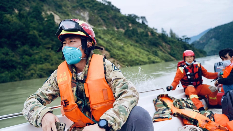 2022年8月,四川雅安市石棉县,乘坐冲锋舟前往地震受灾严重的地区进行采访。