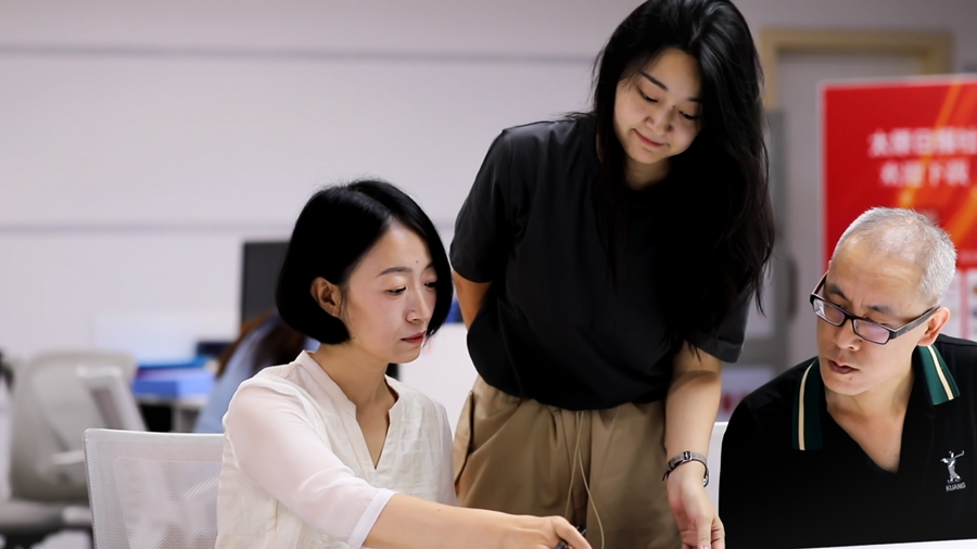 阎轶洁与夜班同事一起看版样