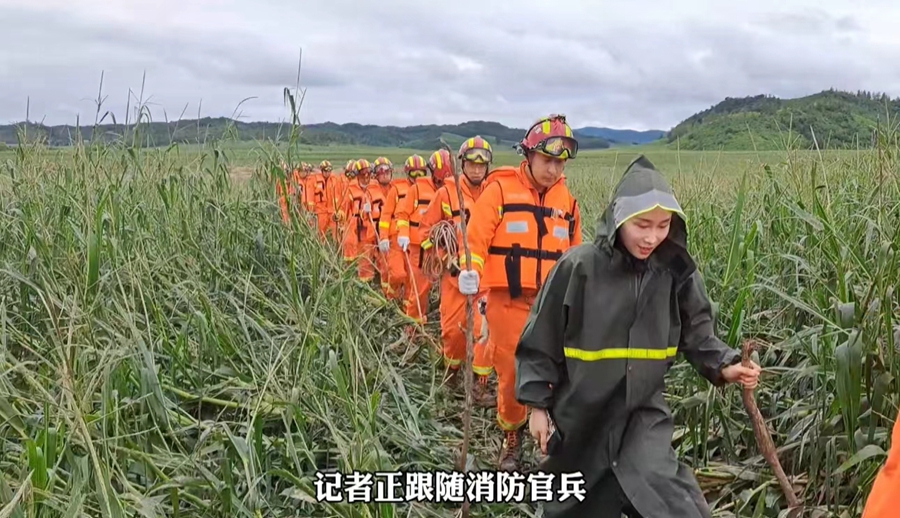 8月7日上午10点30分,在开原镇模范村采访吉林市消防救援支队政府专职大队,并随同消防员一起沿着珠琦河西岸开展救援搜索。