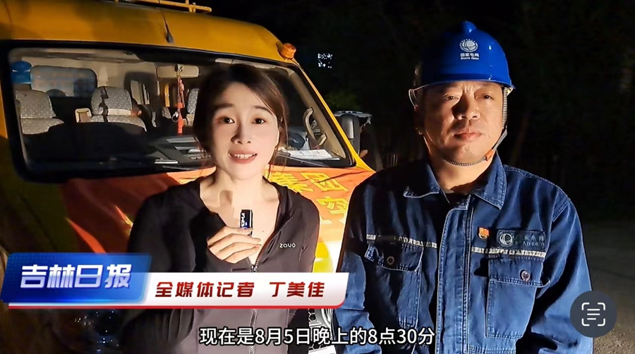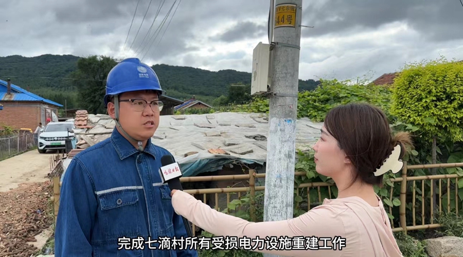 8月8日,在开原镇七滴村,采访国网吉林供电公司对10千伏七永线受损电力设施修复工作。