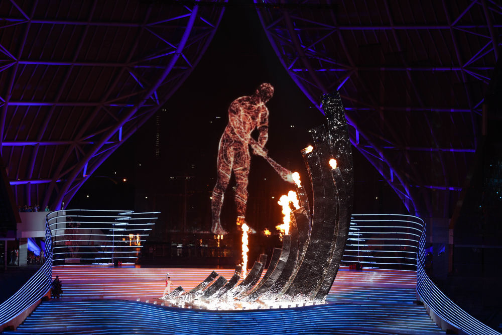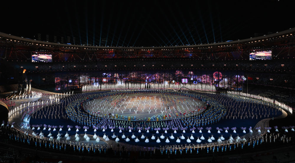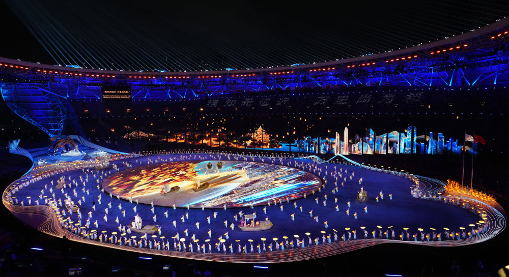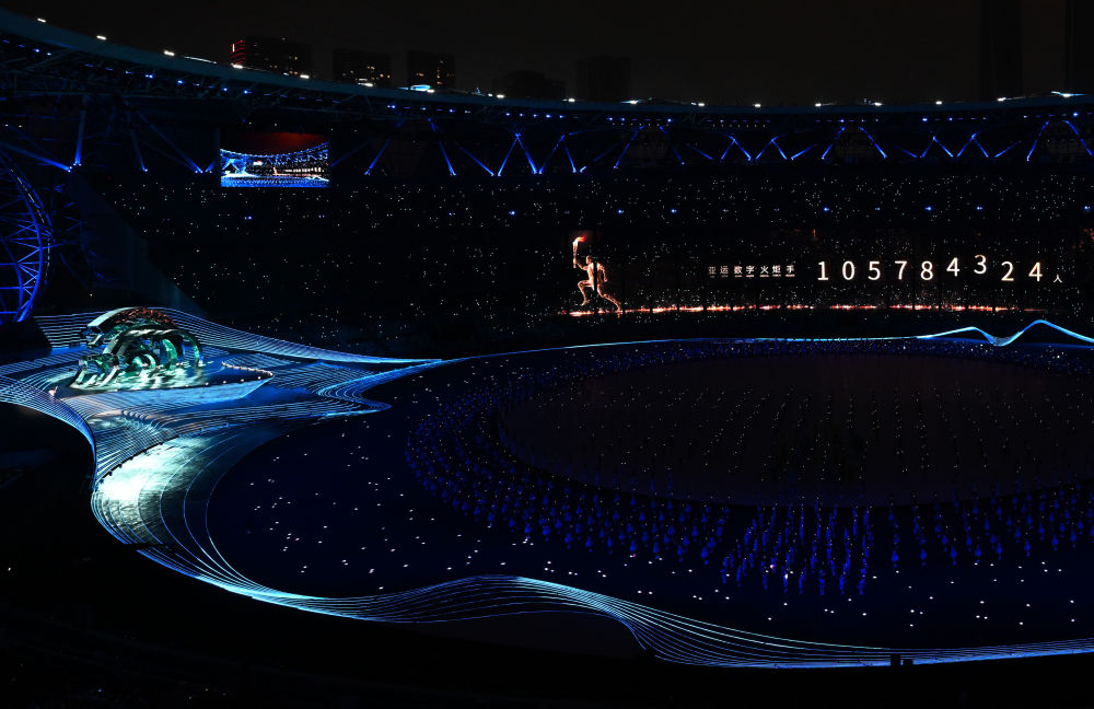 中国农历秋分节气,杭州奥体中心体育场“大莲花”灯光璀璨,万涓成水,奔涌成潮。“数字火炬手”与游泳运动员汪顺共同点燃了象征亚洲大团结的体育之火,杭州第十九届亚运会开幕。