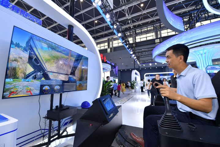 9月7日,参观者在河北省石家庄举行的2023中国国际数字经济博览会上体验挖掘机5G远程驾驶系统。新华社记者 骆学峰 摄