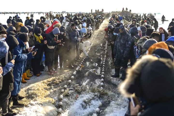 2022年12月28日,游客在查干湖冰面上观看冬捕。新华社记者许畅摄