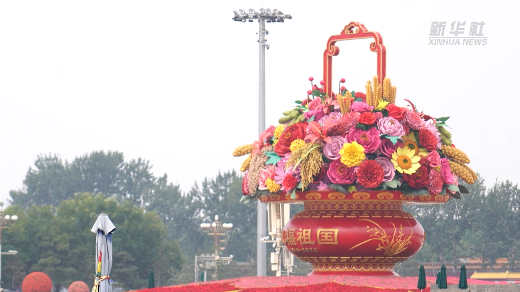 国庆将至,天安门广场及长安街沿线花卉布置工作正有序进行。25日,“祝福祖国”巨型花篮在天安门广场亮相。今年“祝福祖国”巨型花篮顶高18米,以喜庆的花篮为主景,篮内首次应用了“五谷”,即水稻、小麦、小米、黄米、大豆,并结合具有美好寓意的花卉,体现花团锦簇、五谷丰登。