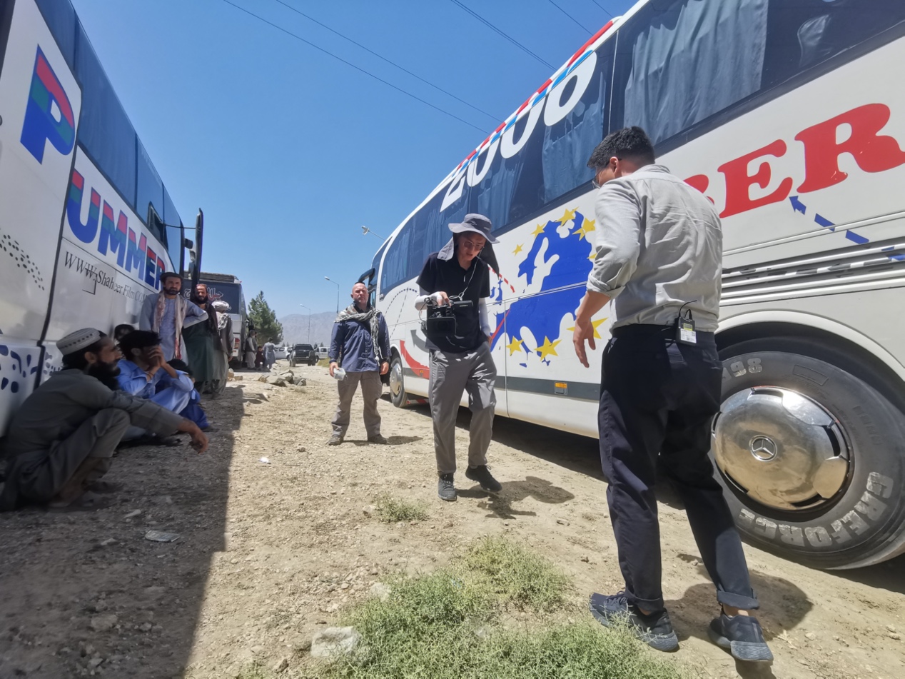 中央广播电视总台-周迦昕-周迦昕在一处难民集中返乡的大巴出发点车旁出镜