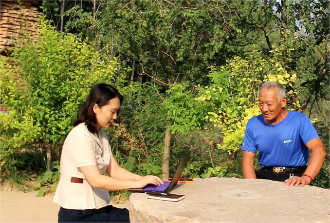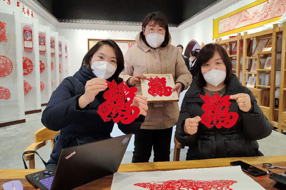 法治日报李娜在临朐县北杨善村采访”善“文化剪纸。