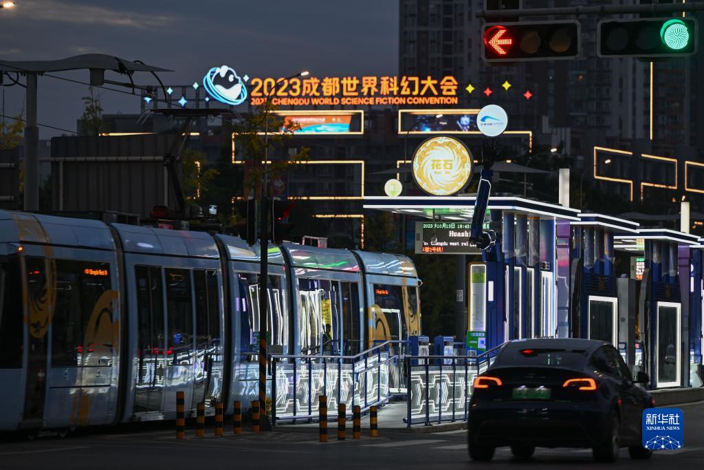 这是10月13日拍摄的成都市郫都区街景。2023成都世界科幻大会将于10月18日在位于成都市郫都区的成都科幻馆举行。郫都区街头巷尾充满了浓厚的“科幻”氛围。新华社记者 胥冰洁 摄