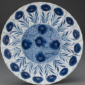 展出的清康熙青花雏菊纹菱口盘。鞍山市博物馆供图。