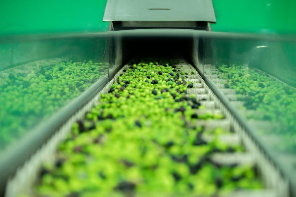 紧接着,工人们将一筐筐油橄榄鲜果搬运到生产车间,一颗颗圆润饱满的油橄榄鲜果被传送到自动化生产线上,经过筛选、清洗、投料、破碎、压榨等多道工序后,一股金黄色的橄榄油涓涓细流从管道口流出。