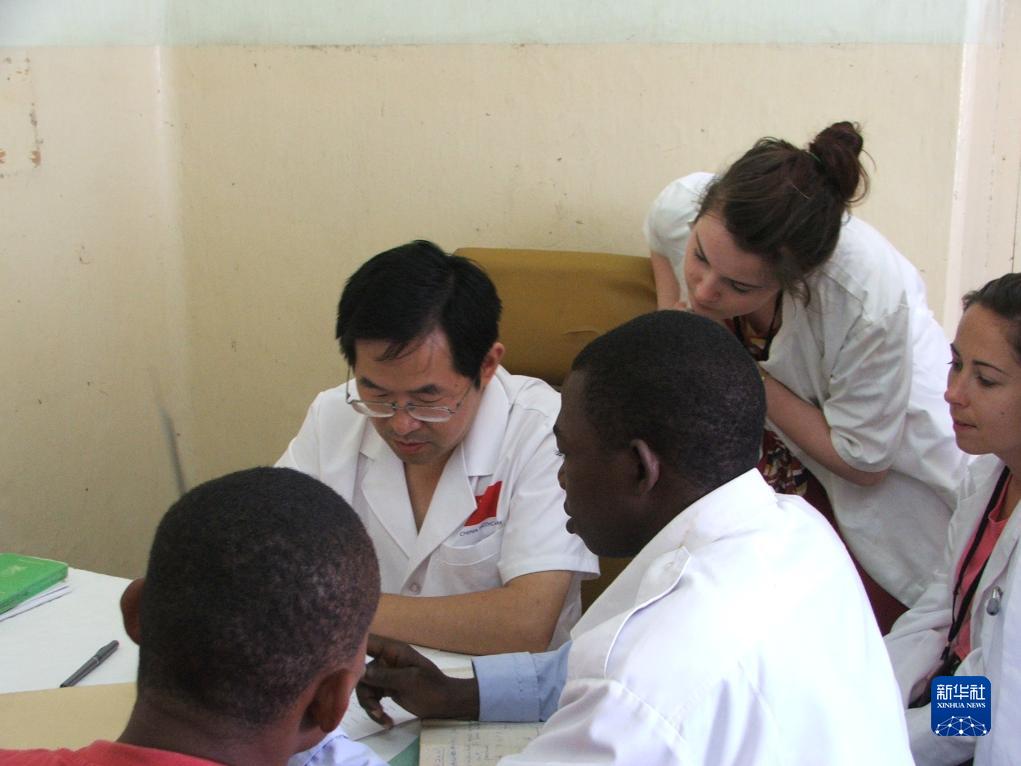 2011年7月22日,在坦桑尼亚桑给巴尔纳兹莫加医院外科门诊,中国第24批援桑给巴尔医疗队队长卢建林为当地患者诊治并带教实习生。新华社发(国家卫生健康委供图)