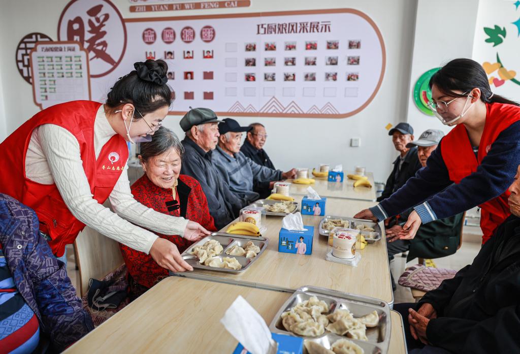 志愿者在山东省荣成市寻山街道清河村暖心食堂为老人们送餐。新华社发(李信君摄)