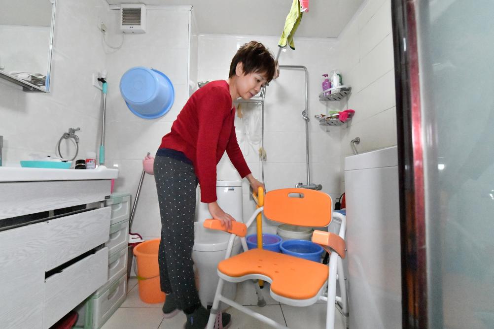 在天津市河西区尖山街道,居民在家中卫生间内摆放助浴椅、防滑扶手等适老化改造设施。新华社记者 孙凡越 摄