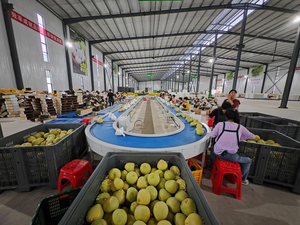 在利众果业包装车间,工人正在包装文旦柚。新华社记者陈弘毅 摄