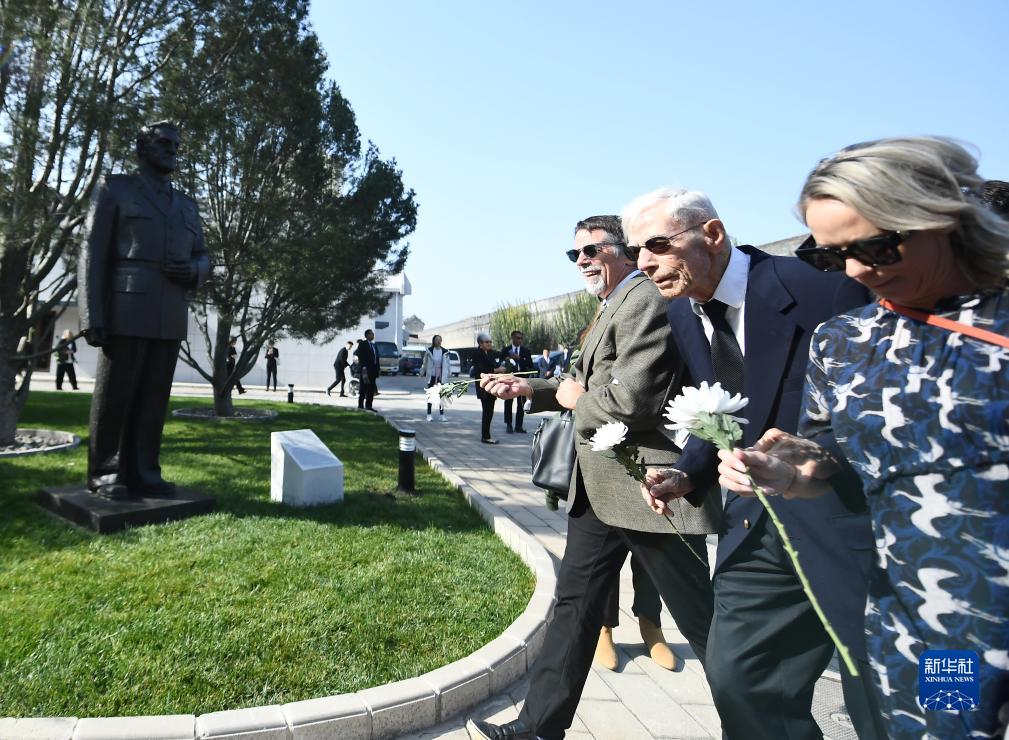 10月30日,飞虎队老兵哈里·莫耶(中)向陈纳德将军雕像献花。新华社记者 张晨霖 摄