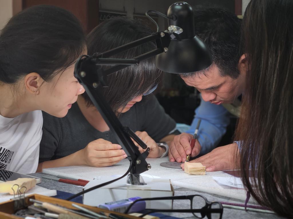 上海市民艺术夜校篆刻陶刻课堂上吴宝平(左三)正在指导雕刻手法。新华社记者 王默玲 摄