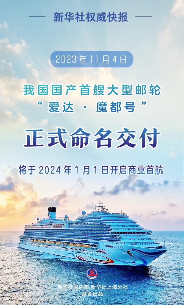 11月4日,我国国产首艘大型邮轮“爱达·魔都号”在上海正式命名交付,将于2024年1月1日开启商业首航。