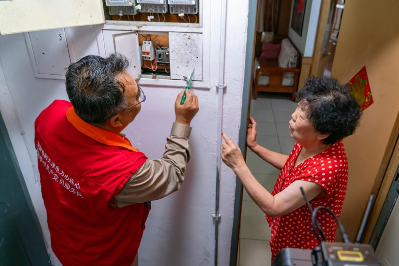 9月24日,国家电网天津滨海供电分公司配电抢修班班长张黎明正在帮居民检查供电设备。新华网 钟奕 摄