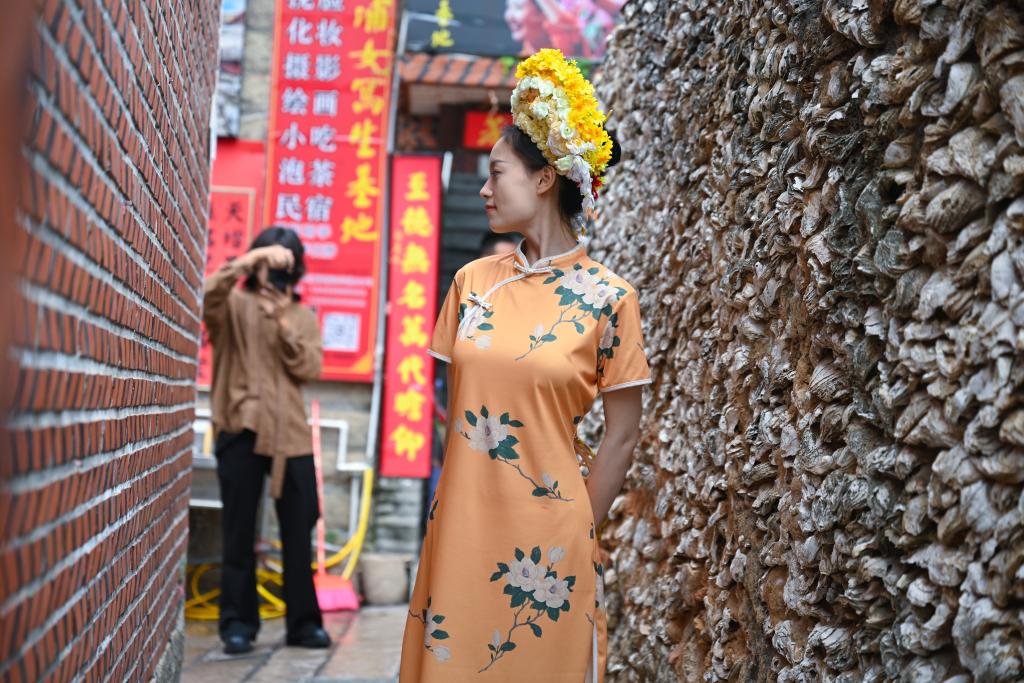 体验“簪花围”的游客在泉州市蟳埔村的蚵壳厝旁拍照。新华社记者 周义 摄