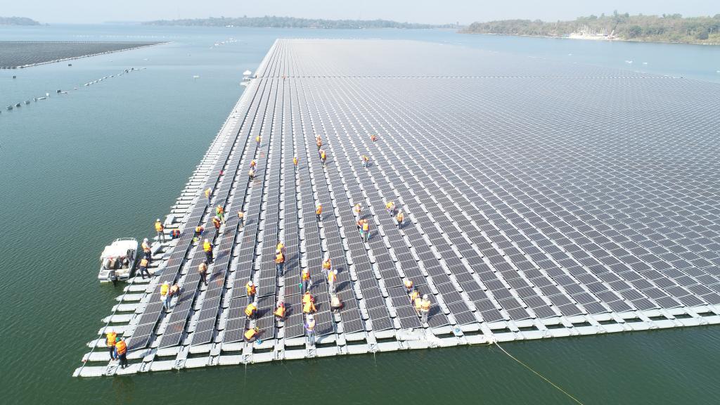 2021年1月23日,施工人员检查泰国乌汶府诗琳通大坝综合浮体光伏项目的太阳能板安装情况。新华社发(泰国国家电力局项目组供图)