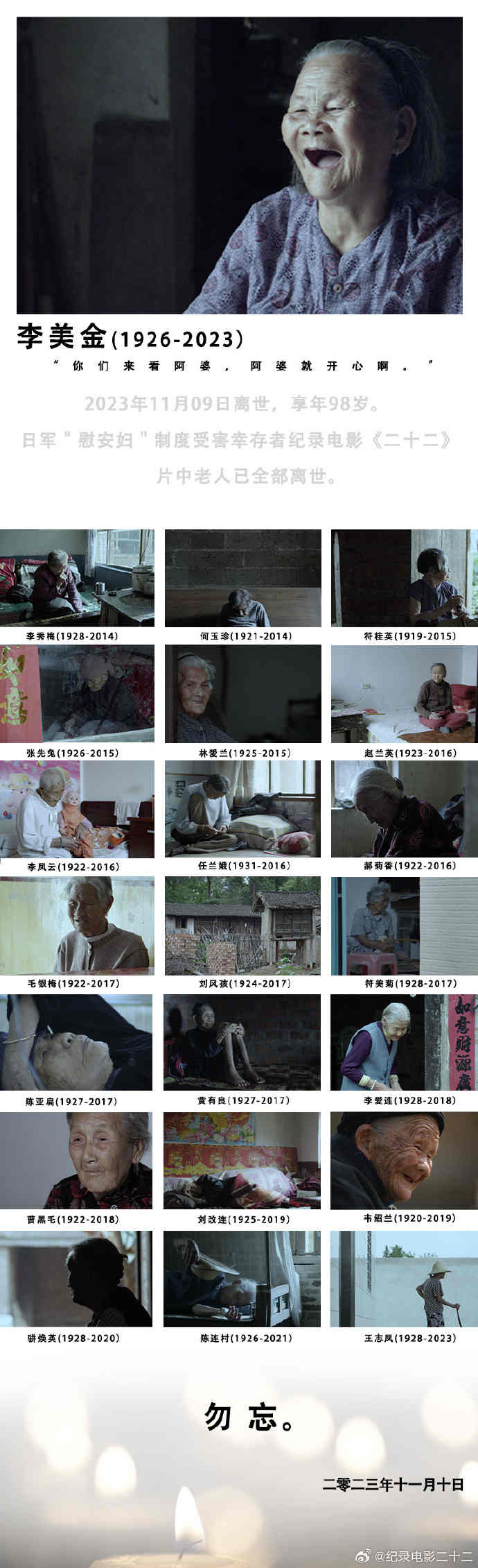 如今,随着李美金老人去世的消息传来,纪录片《二十二》中日军“慰安妇”制度受害幸存者已变成0人。