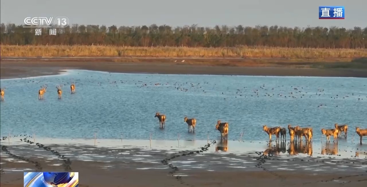 这里还生活着另外一种国家一级保护动物麋鹿,它们可以到深水区洗个澡、打个滚。