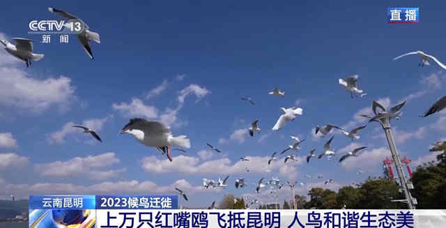 总台记者 郭琳洁:在昆明滇池大坝旁,成群的红嘴鸥在天空中翱翔,它们成群结队,上下翻飞,非常壮观,吸引了不少市民游客前来欣赏。