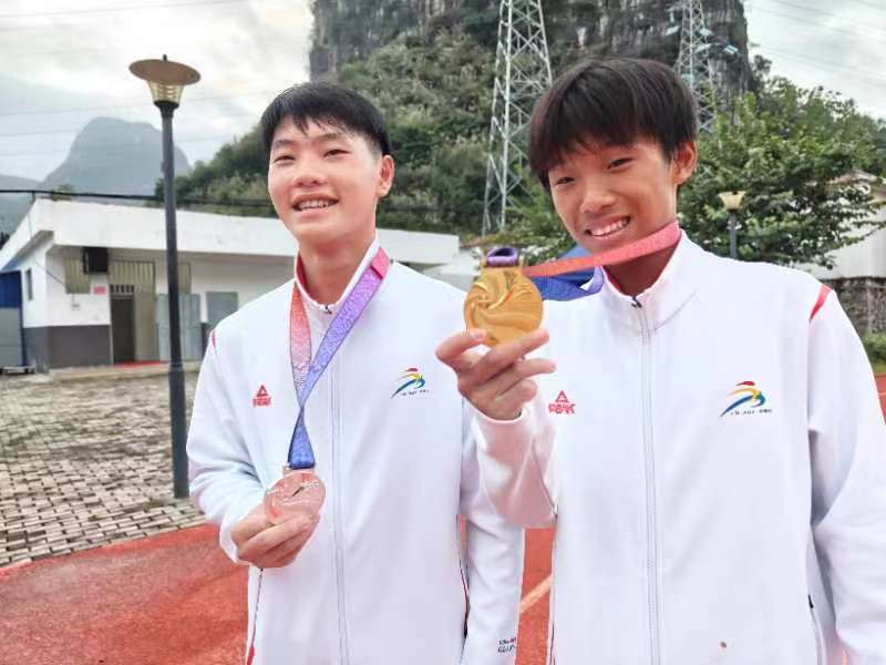 图为获得学青会攀岩项目奖牌的两位马山小将——黄俊宁(左)与何鑫