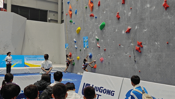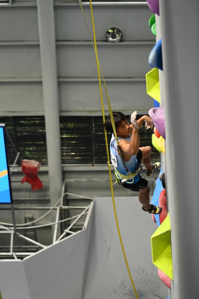 图为马山攀岩小将在首届学青会攀岩比赛中
