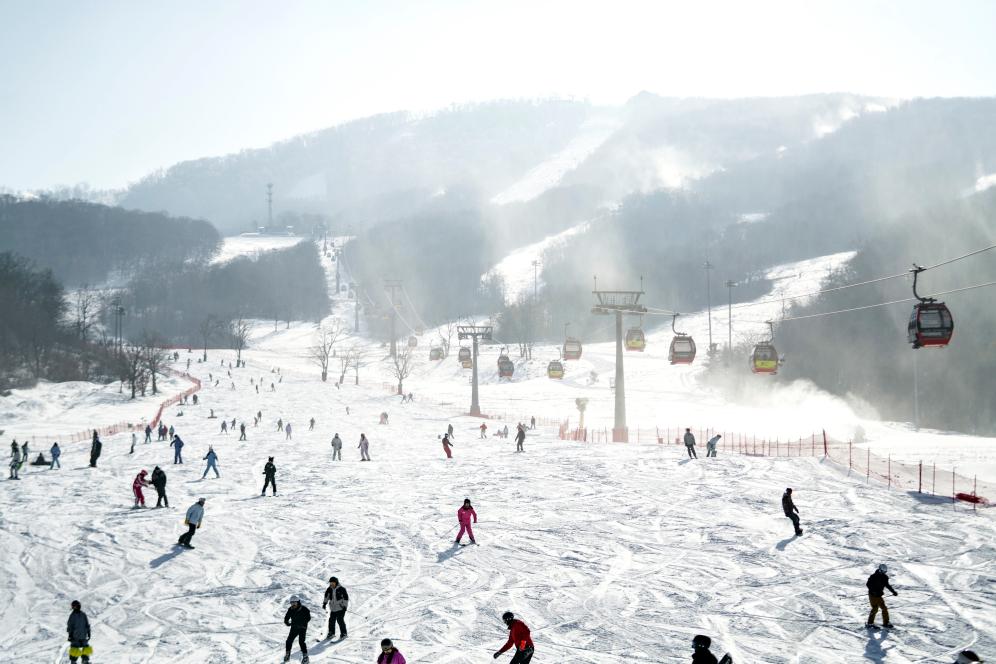 通往各条雪道的索道前,等待上山的滑雪者早早排起长队。山顶众多滑雪者或穿戴整理雪具,或进行准备热身活动,而后迫不及待地疾驰而下。