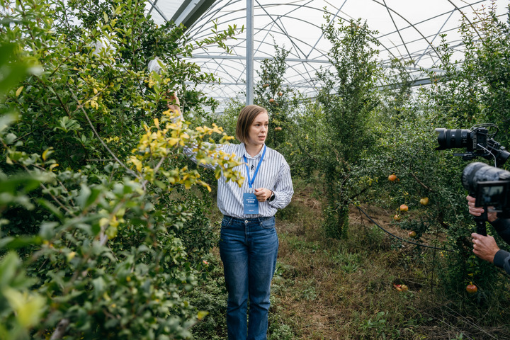 10月12日,欧亚主流媒体考察团成员在陕西省渭南市潼关县软籽石榴产业园内采访调研。新华社发(朱军强 摄)