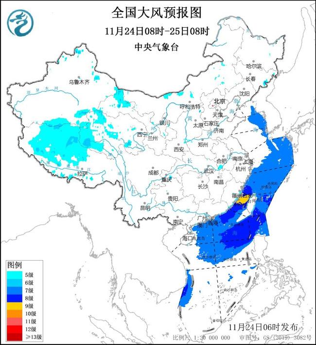 预计,11月24日08时至25日08时,甘肃西部、青海中西部、西藏中西部等地有5级、阵风6~7级的大风;黄海东部海域、东海东部和南部海域、台湾海峡、台湾以东洋面、巴士海峡、南海中部、北部、西南部海域将有7~8级、阵风9级的大风,其中台湾海峡部分海域风力可达9级、阵风10级。