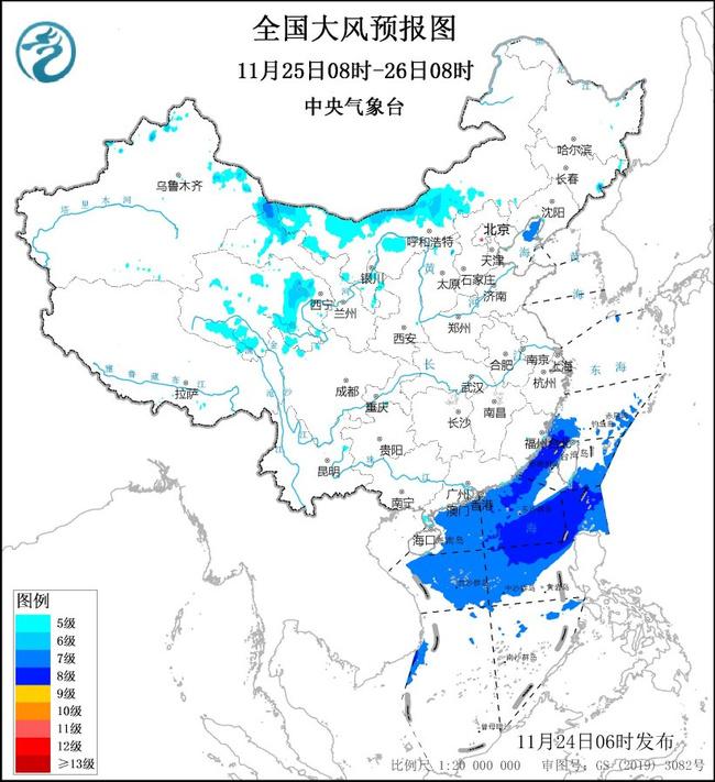11月25日08时至26日08时,内蒙古中西部、青海、甘肃西部等地有5~6级、阵风7~8级的大风;渤海、东海南部海域、台湾海峡、台湾以东洋面、巴士海峡、南海北部、中部、西南部海域将有7~8级、阵风9级的大风,其中台湾海峡部分海域风力可达9级、阵风10级。