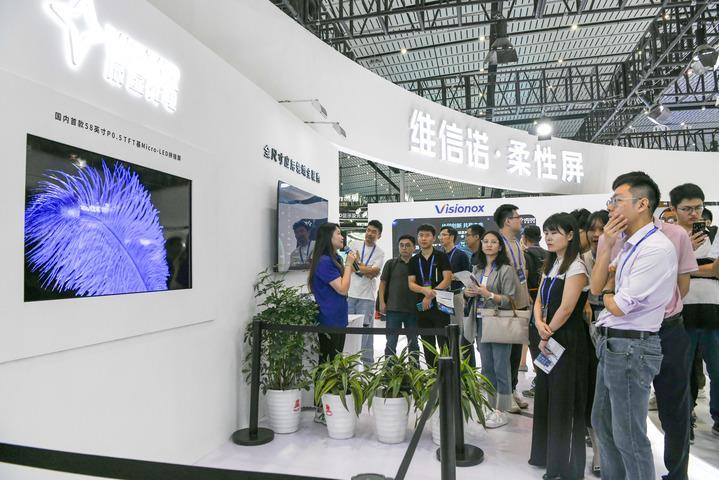 在“2023世界显示产业大会新型显示创新成果展”现场,观众在观看58英寸P0.5TFT基Micro-LED拼接屏(2023年9月7日摄)。新华社记者 唐文豪 摄