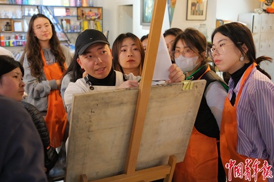 宋琰的油画课已经开了3次,16名学员次次全勤。当天的课上,他们学习临摹一张风景照片,宋琰时而把所有学员叫到一起指导,时而走到一个学员的座位前,帮助调整画布上的笔触。