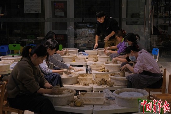12月3日,北京市朝阳区一处建材城顶层,夜校陶艺课老师柴鑫杰(右四)在授课,当天课程的内容是陶艺拉胚。