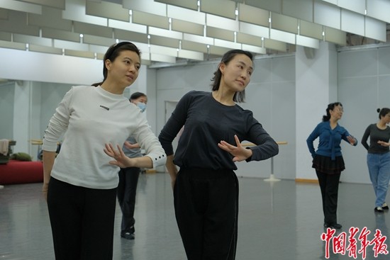 12月3日,北京市东城区文化馆,古典舞公益培训班上,90后学员张沈锐(左)跟随文化馆老师石原学习技术动作。以前,这里的学员大多为60后、70后,现在逐渐开始涌现年轻人的面孔。张沈锐所在的班里共20名学员,有4名90后。