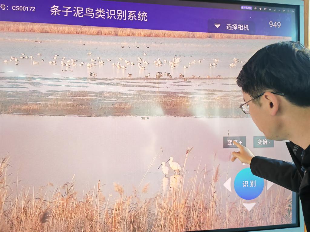 条子泥湿地工作人员演示操作“智能观鸟”大屏。新华社记者郑生竹 摄