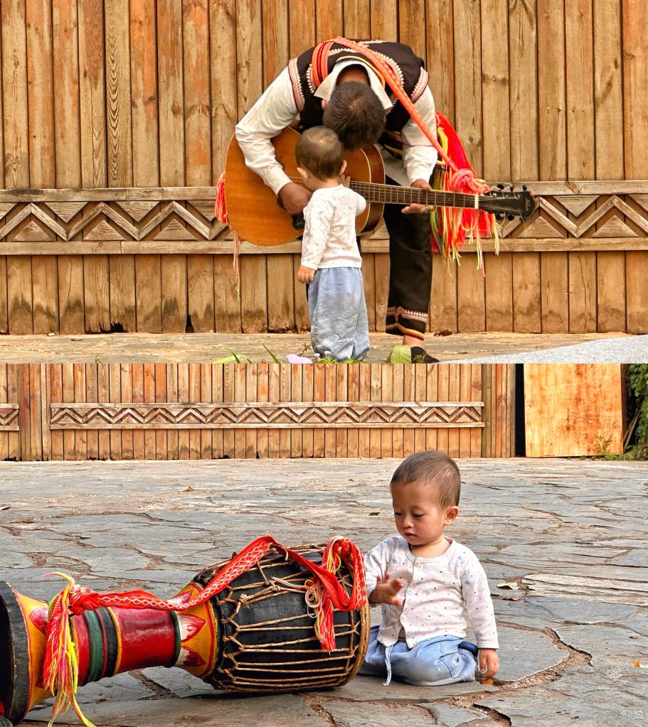 象脚鼓一响,身着拉祜盛装的“百灵鸟”们弹拨琴弦,放声歌唱,热情舞蹈……舞台旁,一个一岁半的小男孩,也随着音乐摆手、敲打着木鼓。