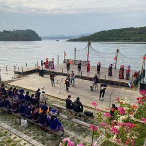 百色市右江区永乐镇西北乐村位于澄碧湖畔,村里非遗体验馆和农家书屋等木质建筑别具特色,文艺队队长岑美江正组织村民们在临湖舞台上进行歌舞表演,欢迎游客的到来。