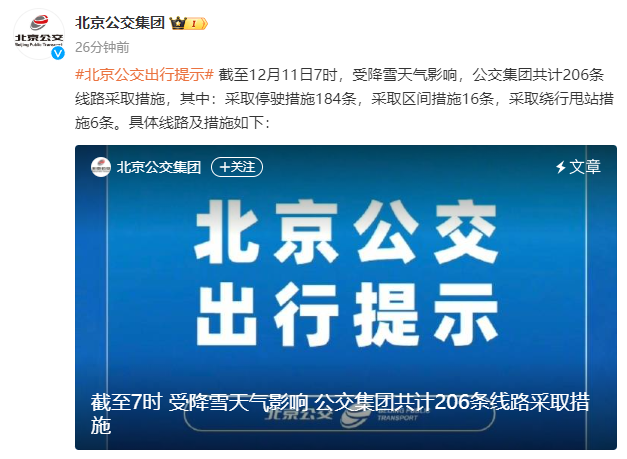 原标题:截至7时,受降雪影响,北京公交206条线路采取措施