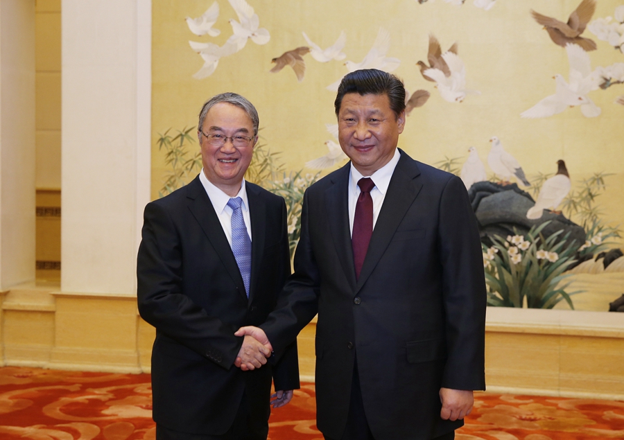 2015年2月11日,中共中央举行党外人士迎春座谈会。这是习近平同志与桑国卫同志握手。