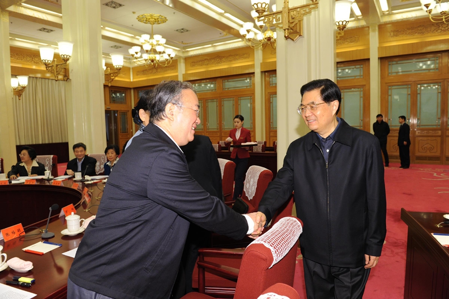 2010年11月30日,中共中央在北京中南海召开党外人士座谈会。这是胡锦涛同志与桑国卫同志握手。