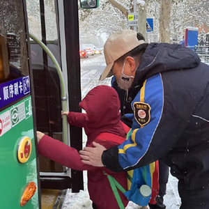 司乘人员护送小乘客登上北京通学公交车。(北京公交集团供图)