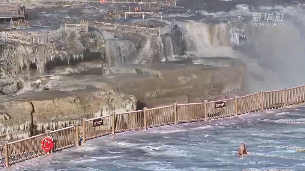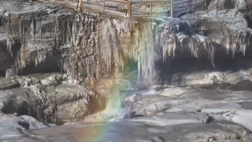 近日,受降温天气影响,黄河壶口瀑布出现冰挂美景,层层叠叠,晶莹剔透,与瀑布上空的彩虹交相辉映,为冬日的壶口瀑布增添一抹亮色和诗意。