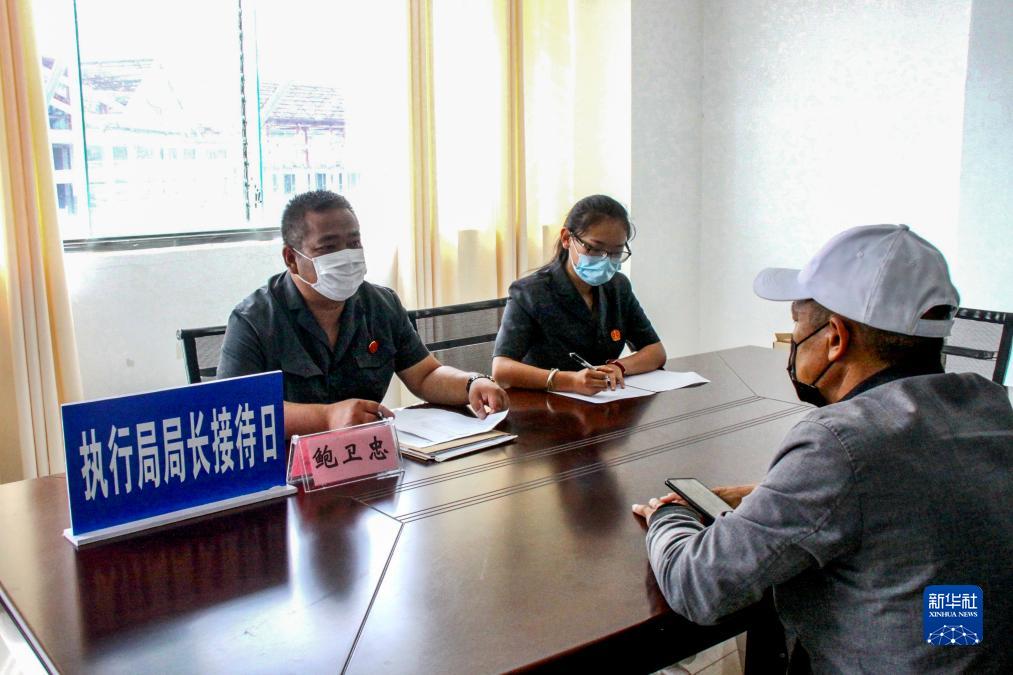 执行局局长接待日,鲍卫忠(左)在云南省沧源佤族自治县人民法院执行指挥中心接待案件当事人(2020年6月18日摄)。新华社发