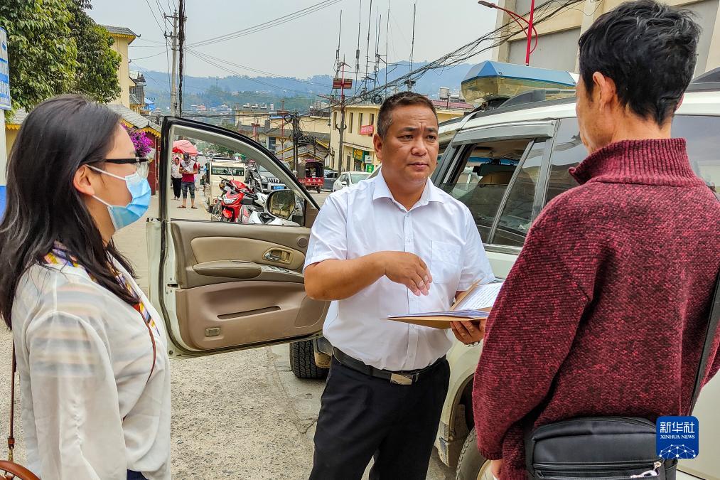 鲍卫忠(中)在云南省临沧市沧源佤族自治县勐角傣族彝族拉祜族乡农贸市场附近和案件当事人了解情况(2021年4月2日摄)。新华社发